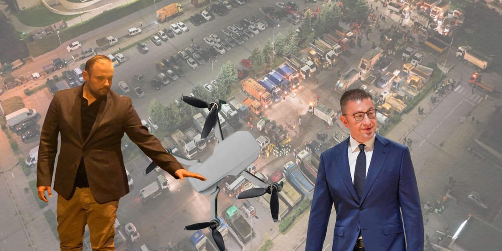 На шести ноември вечерта, паркингот пред спортскиот центар „Борис Трајковски“ наликуваше на импровизирана база за „спасување“ на градот од ѓубре. Фаровите на десетици камиони и ротациите на комуналните возила го осветлуваа просторот. Возилата беа во готовност. Над нив – кружеше дрон.