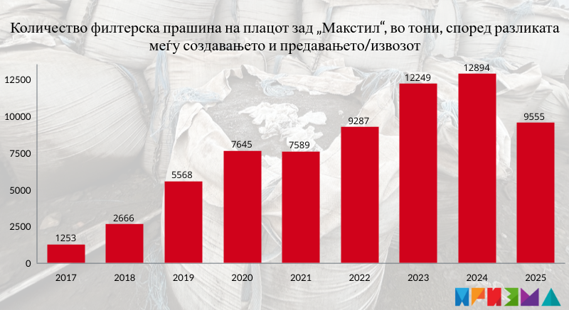 Според табелата што може да се види на интернет-страницата на инспекторатот, од 2015 до 2025 година, филтерот на печката на „Макстил“ собрал 29.877 тони прашина, а компанијата предала 20.321 тон. Овој податок е објавен на 21 февруари годинава, еден ден откако на страницата беше прикачено и решението од инспекцискиот надзор извршен на 2 февруари.
