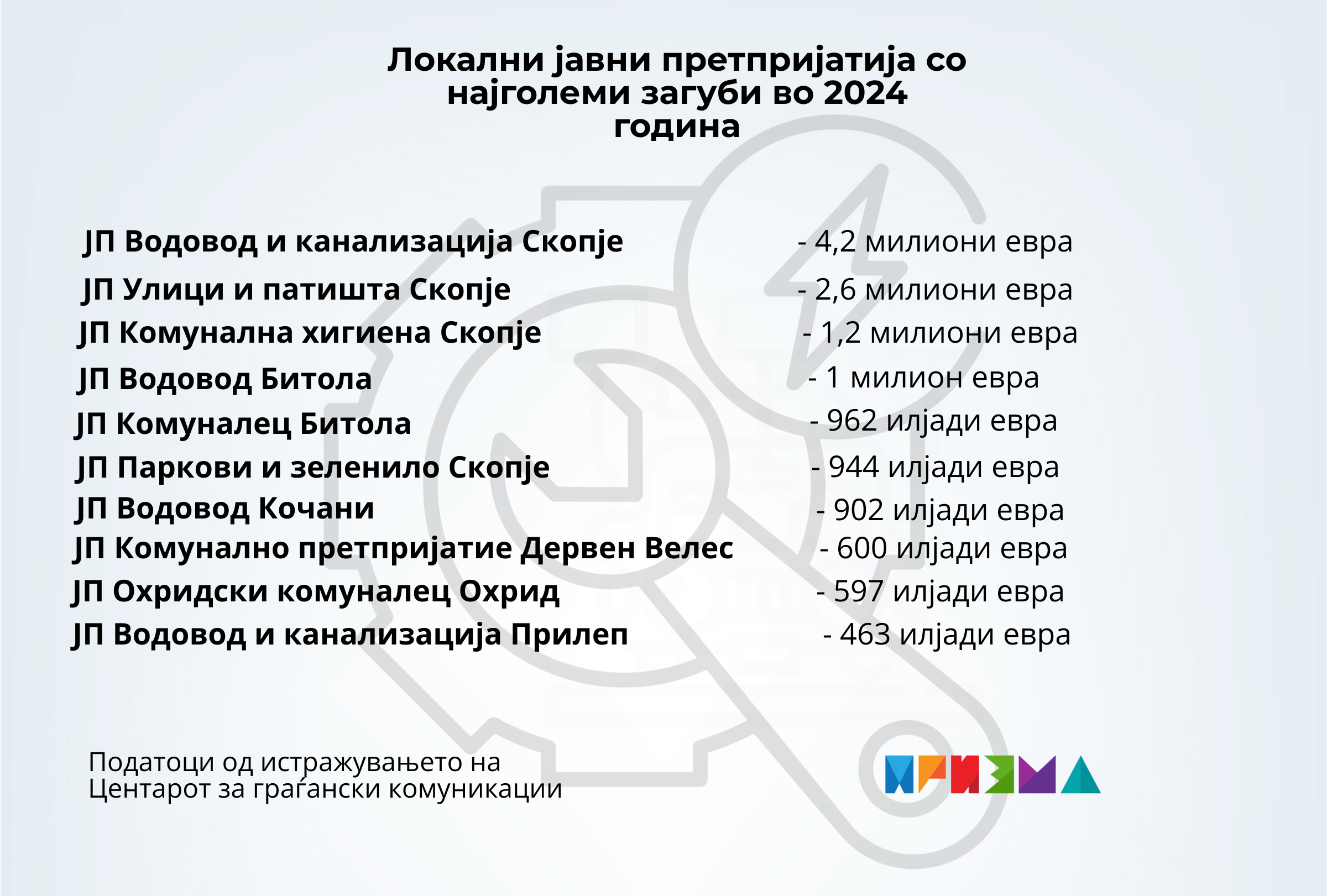 На првите три места со најголеми загуби во земјава се три скопски јавни претпријатија – „Водовод и канализација“, „Улици и патишта“ и „Комунална хигиена.“ На четврто и петто место се битолскиот „Водовод“ и „Комуналец.“