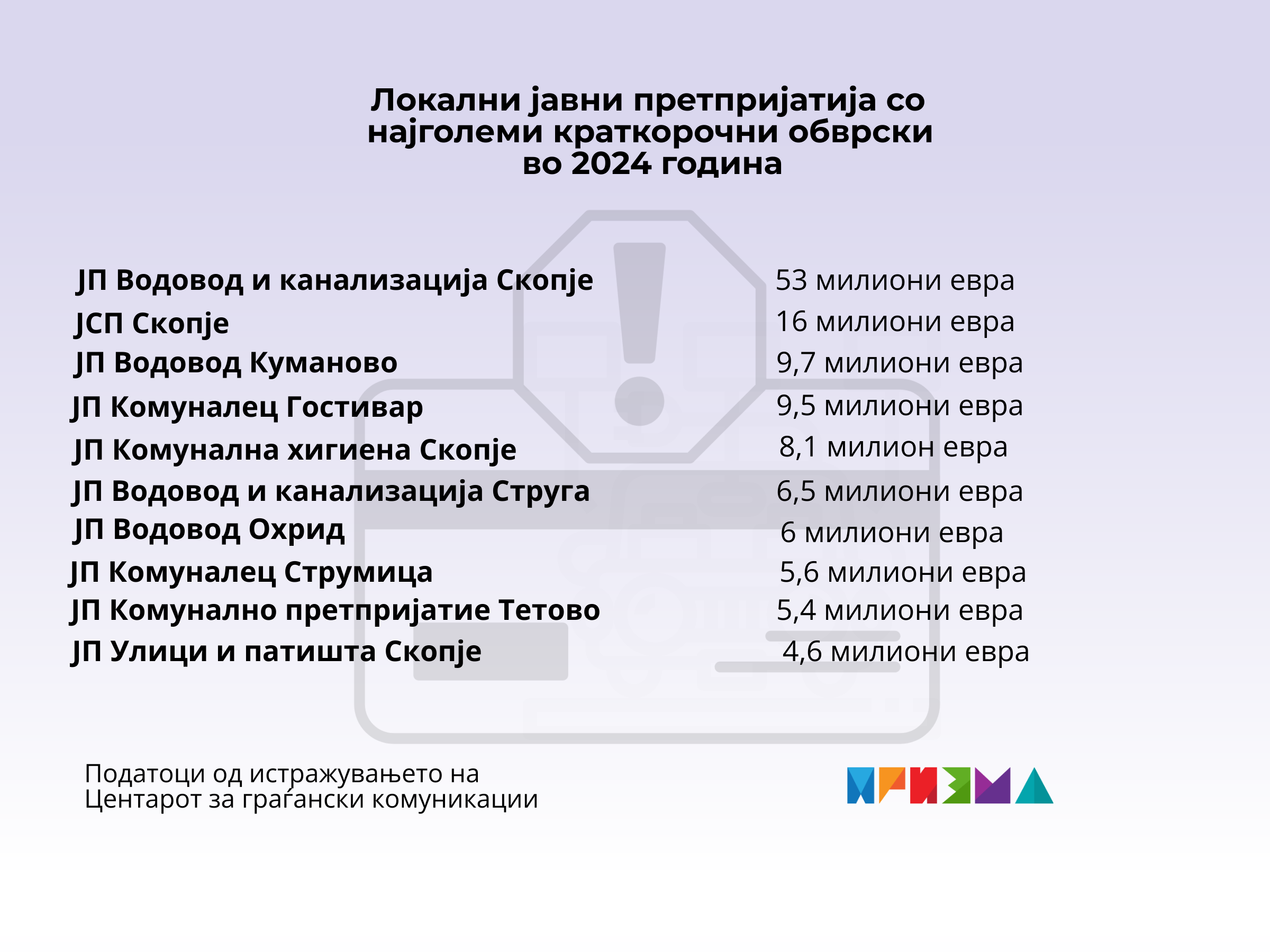 На ниво на држава, пак, 126 од 128-те локални јавни претпријатија, колку што ги има во земјава, забележале вкупен долг од 193 милиони евра, покажа истражувањето на ЦГК. Сумите за овие побарувања се различни од претпријатие до претпријатие и се движат од неколку илјади до десетици милиони евра.