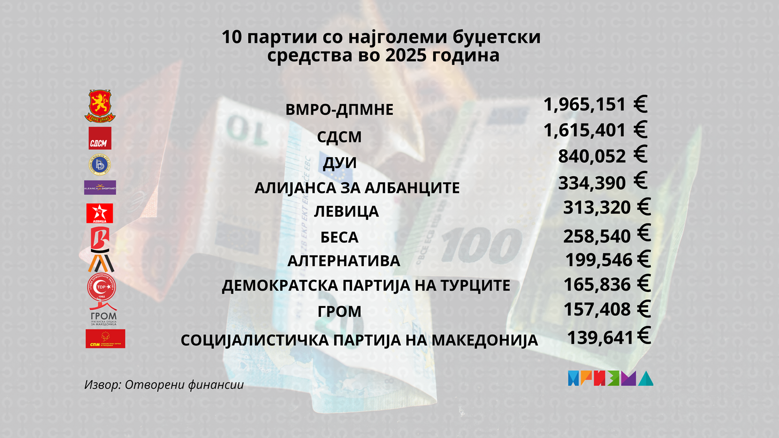 Парите кои Министерството за правда ги исплатило на 10 политички партии во 2025 | Инфографик: БИРН
